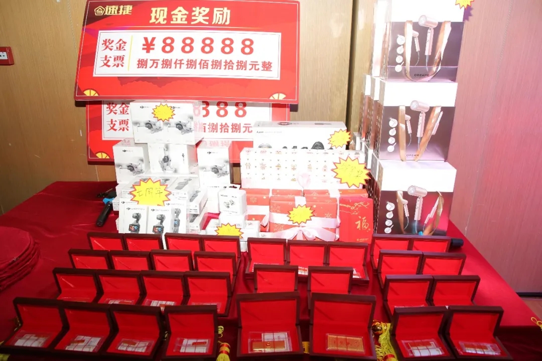 年会上,我们为入职五周年以上的战友颁发——大疆无人机、pocket3运动相机和韶音运动耳机等周年纪念礼物,致敬他们的坚守与卓越。紧接着,优秀团队与优秀个人黄金奖颁奖环节更是将气氛推向另一个高潮。优秀团队斩获18888元-88888元现金激励,30余位精英客户经理荣获10克-100克黄金大奖,愿以此为激励,砥砺奋进,勇攀高峰!每位获奖者都表达了深深的感恩之情,他们感谢领导的指导、同事的支持、家人的理解,言语真挚,令人动容。这一刻,荣誉不仅属于个人,更属于每一个为梦想奋斗的公司成员。